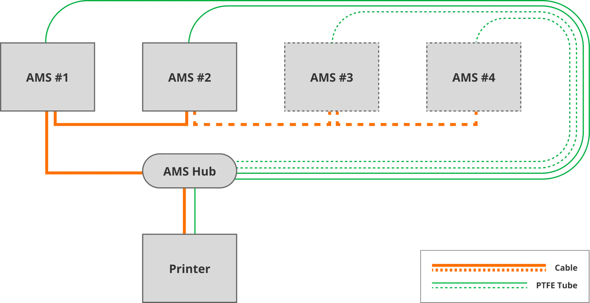 * You will need a Bus Cable (4pin) to connect the AMS Hub to the printer. Besides the 4-pin cable, the Bambu Lab AMS Hub includes all necessary accessories to connect 2x AMS units to the printer