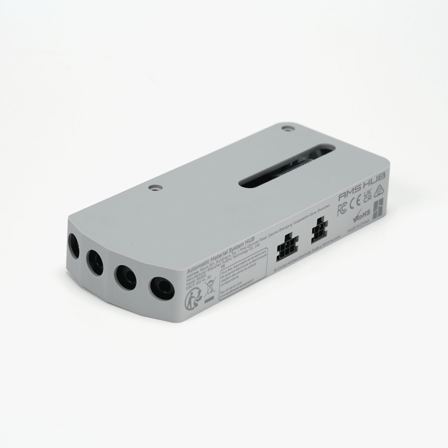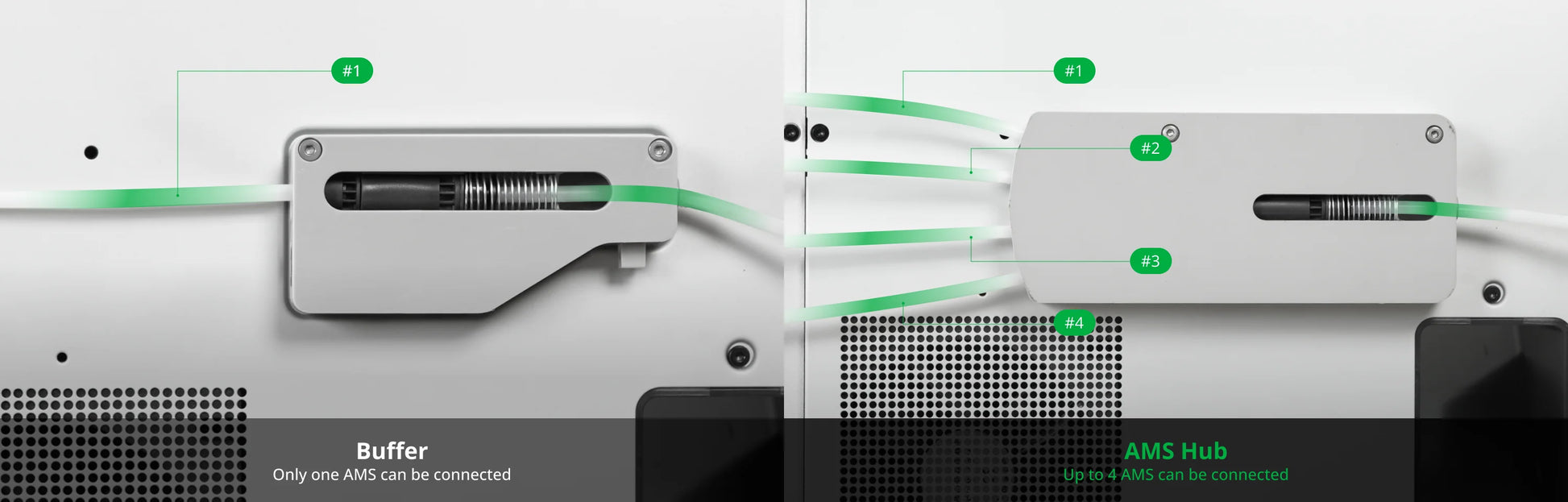 The AMS Hub is used to expand the number of AMS connected to Bambu X1/P1 series printers from 1 AMS unit (4 channels) to a maximum of 4 AMS units (16 channels) to improve the refueling speed across your multiple AMS units and support the redundancy of a buffered signal.